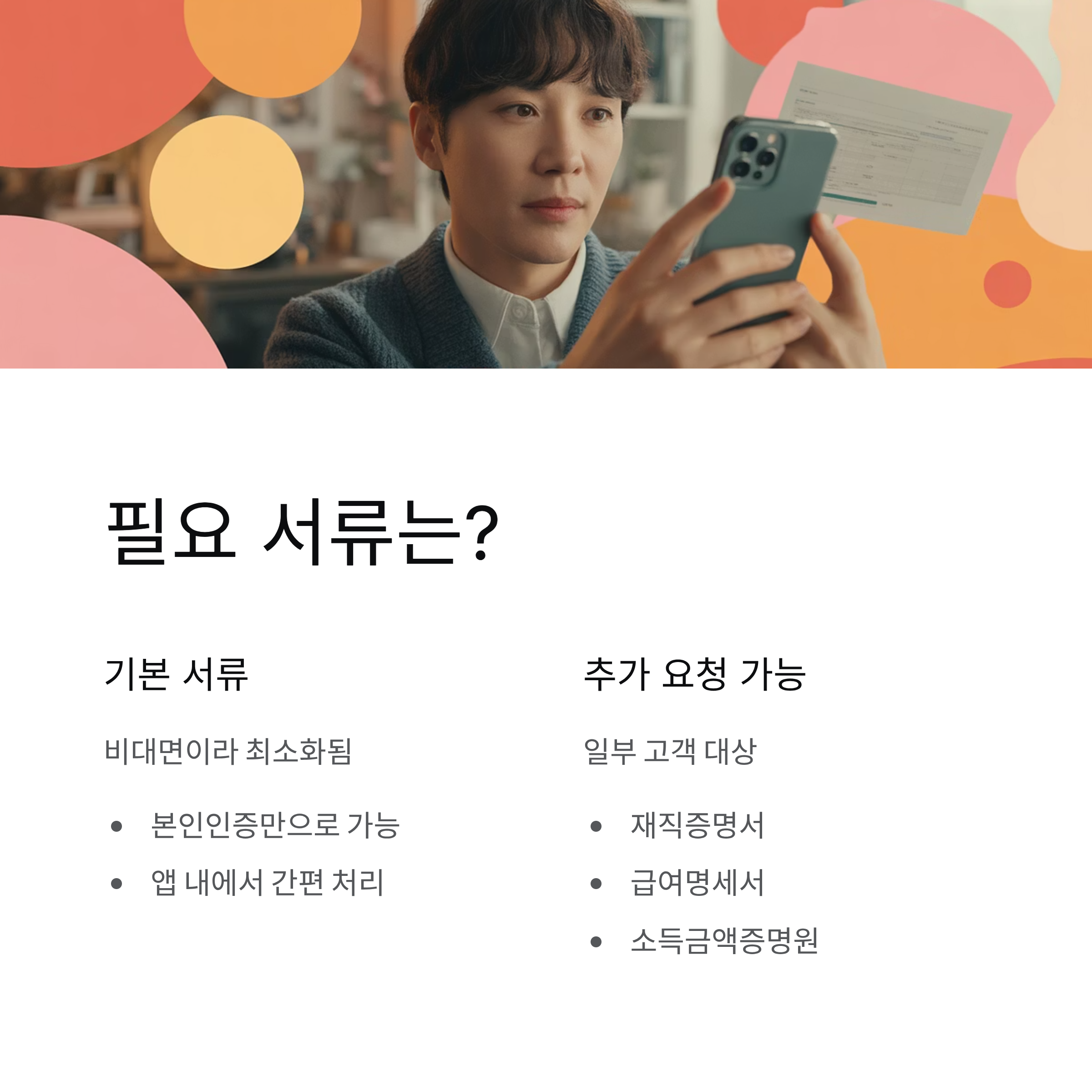 기본적으로 비대면 상품이기 때문에 별도 서류 제출이 최소화되지만, 일부 고객에게는 재직·소득 증빙(재직증명서, 급여명세서, 소득금액증명원 등)을 요청할 수 있습니다. 앱 내 안내에 따라 촬영·업로드 방식으로 제출 가능합니다.